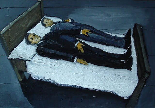 The Krasnals. Whielki Krasnal "Funeral of my parents Peter and Paul / from "Great Poles / according to Maurizio Cattelan". 2011. Oil on board. 38 x 60 cm |