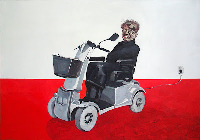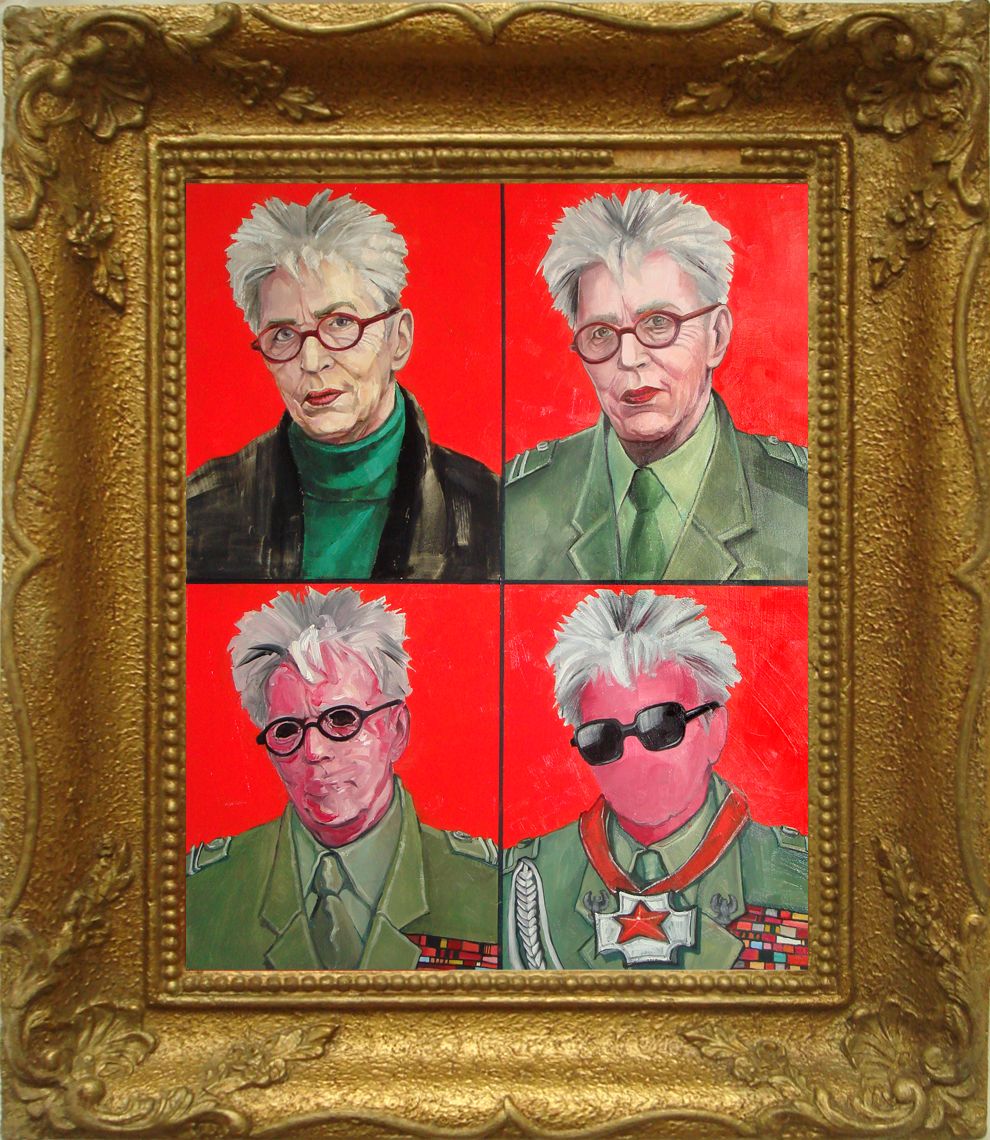 The Krasnals. Whielki Krasnal "Ich fahre nach Berlin / Anda Mobile / Dobre stosunki zależą od długości kabla zasilającego z pieniędzy publicznych / Anda Rottenberg z cyklu Whielcy Polacy. 2011. Olej na płycie. 70 x 100 cm