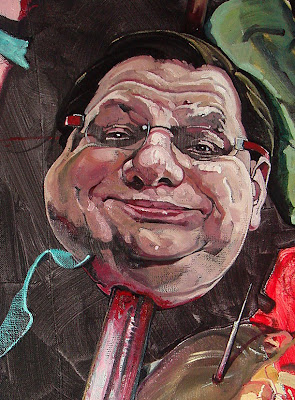 The Krasnals. Whielki Krasnal "Kara śmierci - za czy przeciw / Ryszard Kalisz, z cyklu Whielcy Polacy". 2011. Olej na płótnie. Fragment dużego obrazu. |