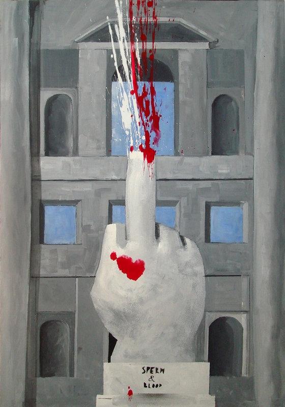 | The Krasnal. Krasnal Hałabała "SPERM & BLOOD, Jak wykrwawić i wyspermić naród polski ? / Tribute to Maurizio Cattelan". 2011. Akryl na papierze. 100 x 70 cm |