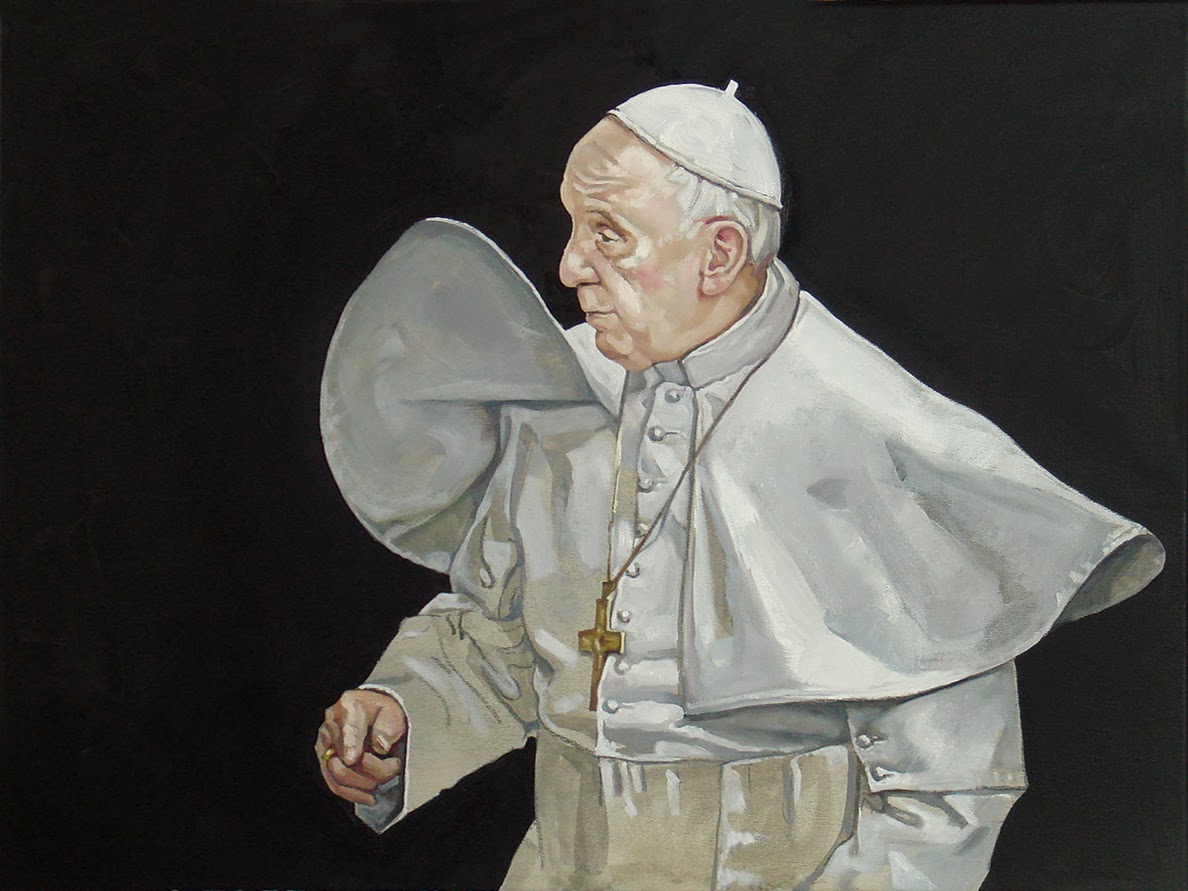 | The Krasnals. Whielki Krasnal. "'- Ale ciemno! Gdzie tu jest światło?' / Papież Franciszek, Jorge Mario Bergoglio - Pierwszy historyczny portret". 2013. Olej na płótnie. 60 x 80 cm |