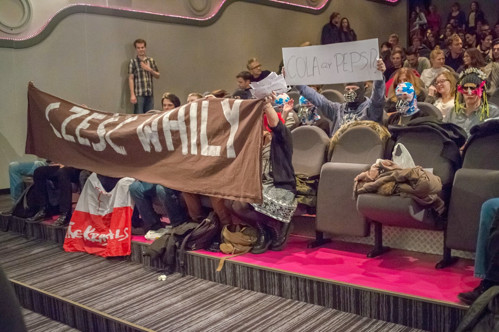 Na scenie, a dokładniej wśród publiczności pojawia się grupa prowokatorów z działaniem o charakterze culture jamming, zakłócającym oficjalny przekaz by sprawdzić czy wybroni się on w tej sytuacji, jak teoria sprawdzi się w praktyce. W pierwszych rzędach grupa artystów manifestująca niezależność sztuki, wolność artystyczną, kontestująca zapodawany system, z pytaniami na transparentach – absurdalnymi, ale dlatego właśnie odpowiednimi do jakości filmu. I do zachowania Sasnala który olał publiczność i odwołał swój przyjazd z powodu „innych zobowiązań” - jak podało kino Muza. Przesłał do The Krasnals list w którym opisuje swój stosunek do sztuki i do innych artystów. Warto przeczytać – udostępniony u nas post niżej.