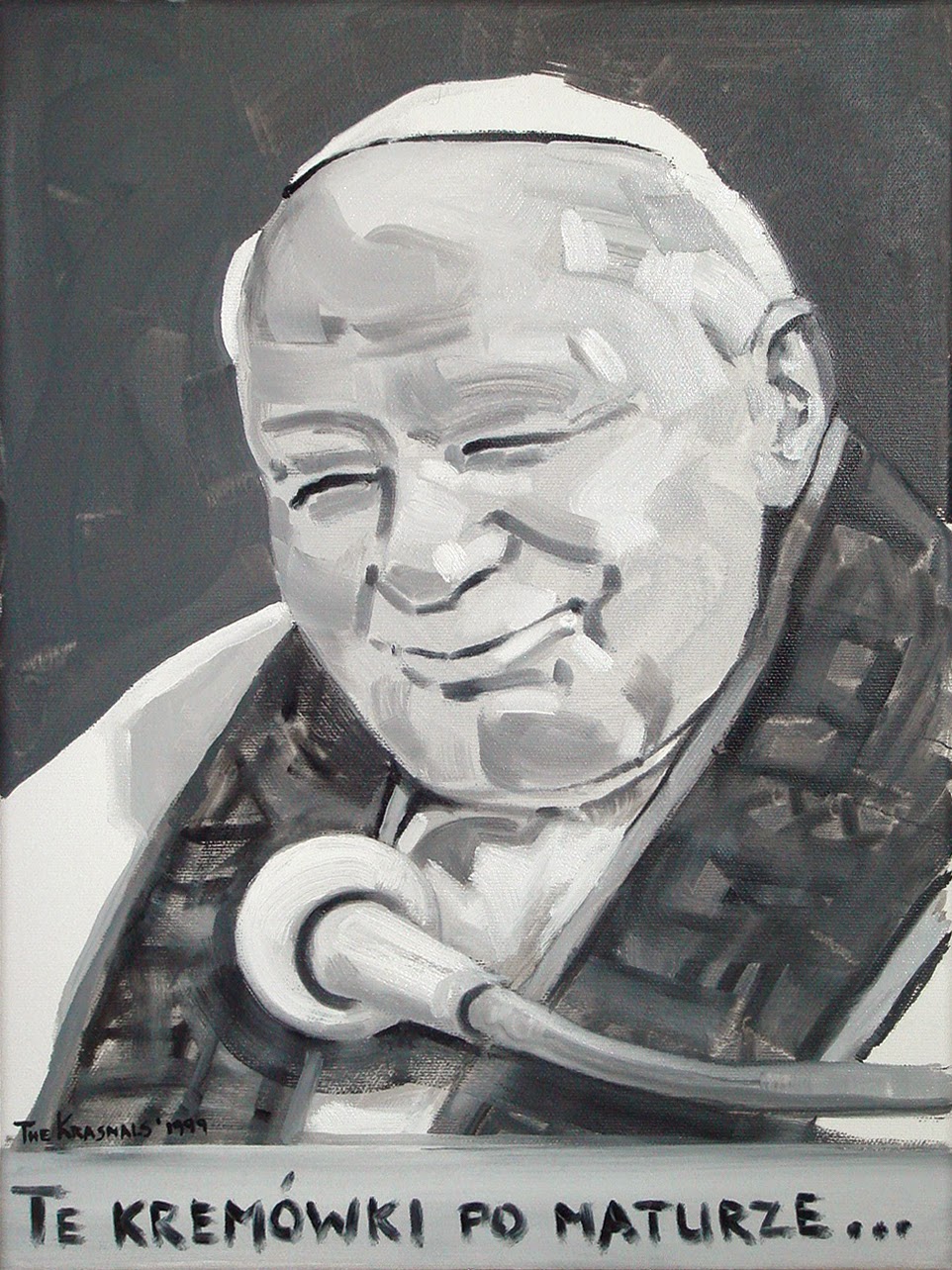 | The Krasnals. Krasnal Przodek "TE KREMÓWKI PO MATURZE…/ Jan Paweł II". 1999. Olej na płótnie. 40 x 30 cm. |