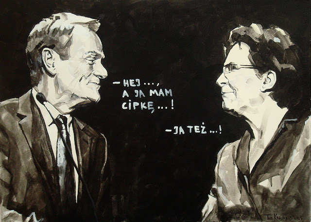 The Krasnals. Whielki Krasnal "Tajne rozmowy przywódców Polski na szczycie o polityce światowej, o ratowaniu świata, o znaczeniu Polski i w ogóle o gender. / Donald Tusk i Ewa Kopacz - z cyklu Whielcy Polacy". 2015. Akryl na płótnie. 50 x 70 cm.